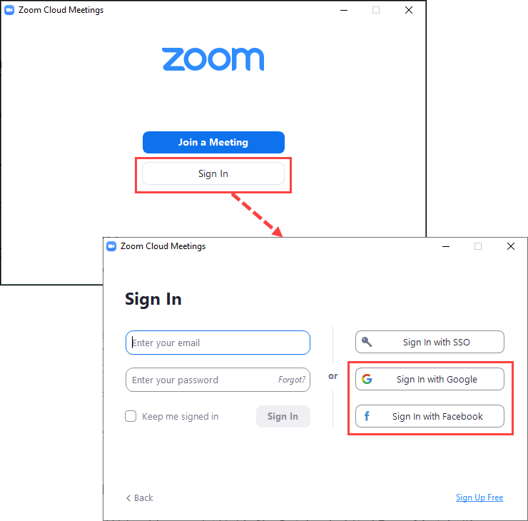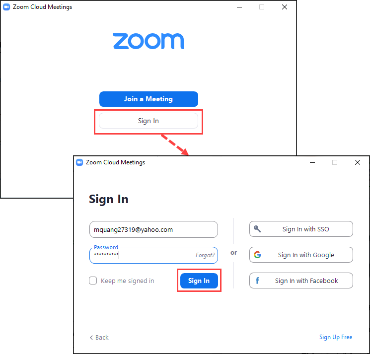 - Mở Zoom, nhấn Sign In/Sign Up Free (trên máy tính)