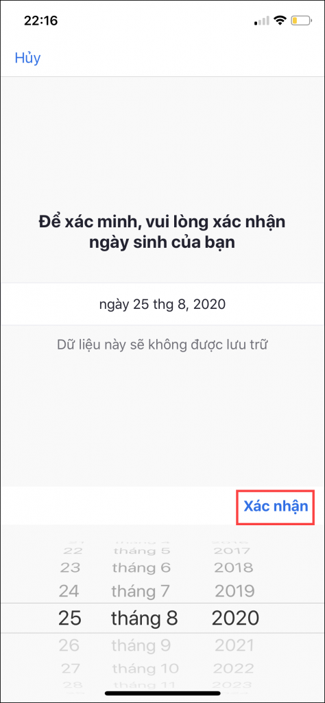 - Nhập ngày sinh của anh/chị, nhấn Continue (máy tính)