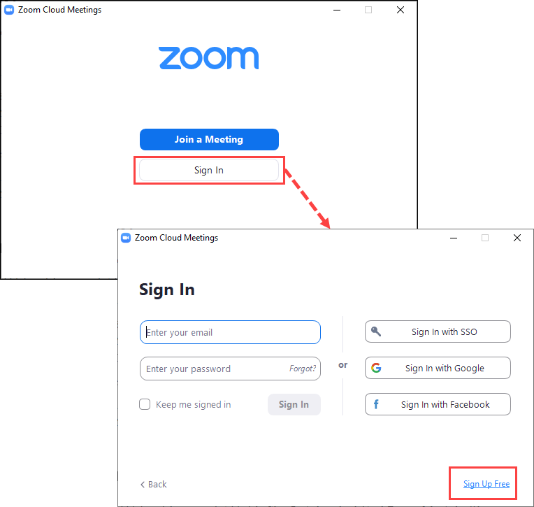 - Mở Zoom, nhấn Sign In/Sign Up Free (trên máy tính)