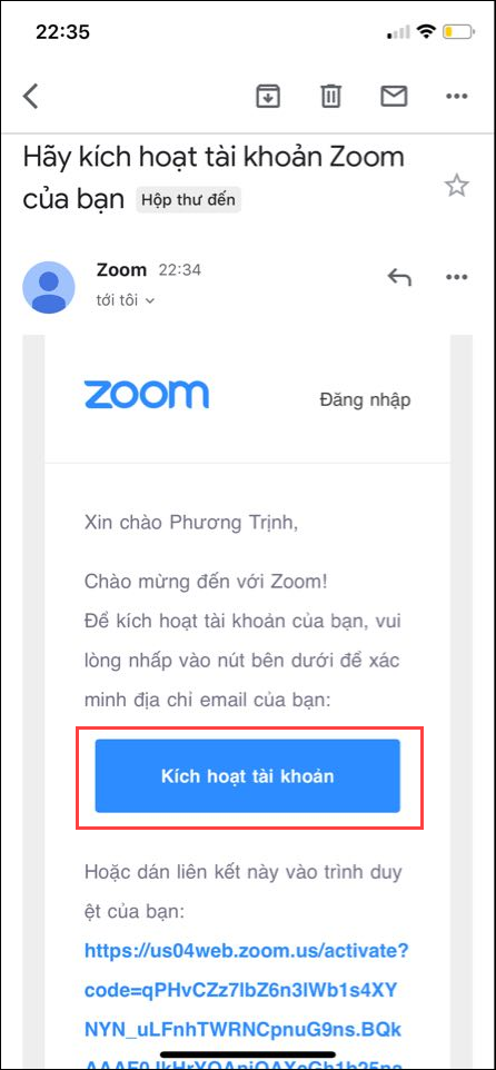 - Zoom sẽ gửi tin nhắn yêu cầu kích hoạt tài khoản theo địa chỉ gmail mà anh/chị đã nhập ở trên.