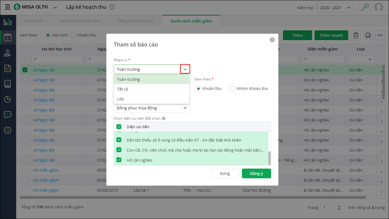 - Phạm vi: Toàn trường (in tất cả học sinh miễn giảm trên một danh sách, không tách trang giữa các lớp), Tất cả (in mỗi lớp một danh sách), theo Khối (in mỗi lớp một danh sách), theo Lớp