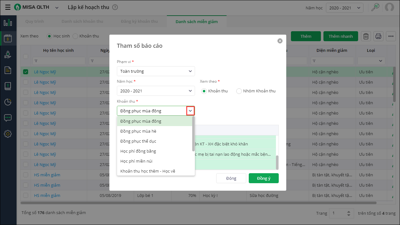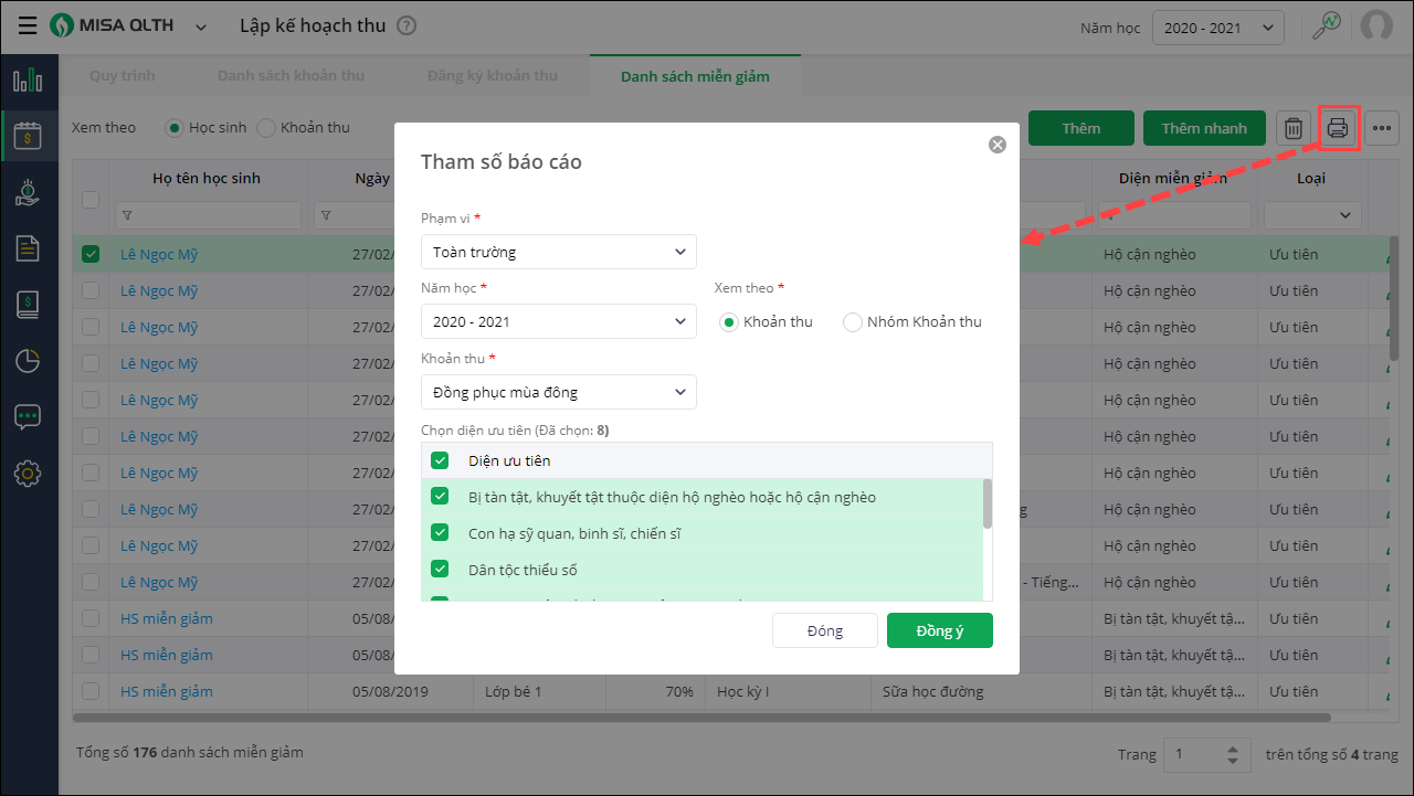 Xem hướng dẫn in danh sách miễn giảm các khoản thu tại đây.