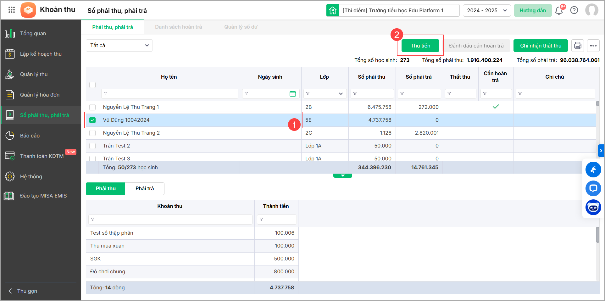 1. Chọn tên học sinh và nhấn Thu tiền,  phần mềm chuyển hướng tới màn hình thu tiền theo học sinh để thực hiện các công việc thu tiền học của học sinh đó.