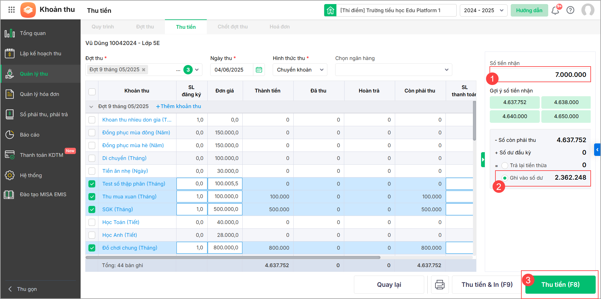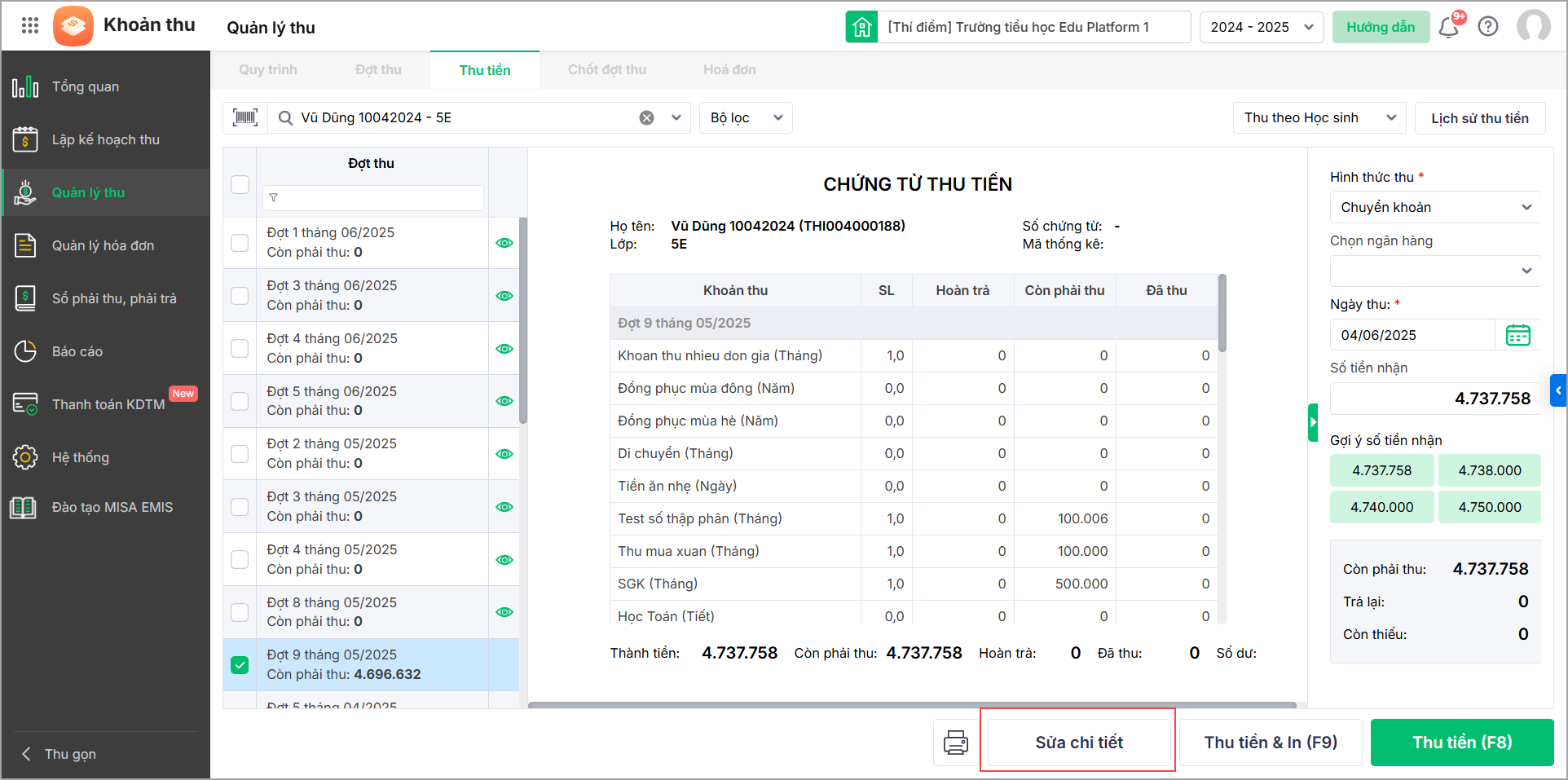 2. Nhấn Sửa chi tiết, nhập số tiền nhận và chọn Ghi vào số dư số tiền thừa được đóng.