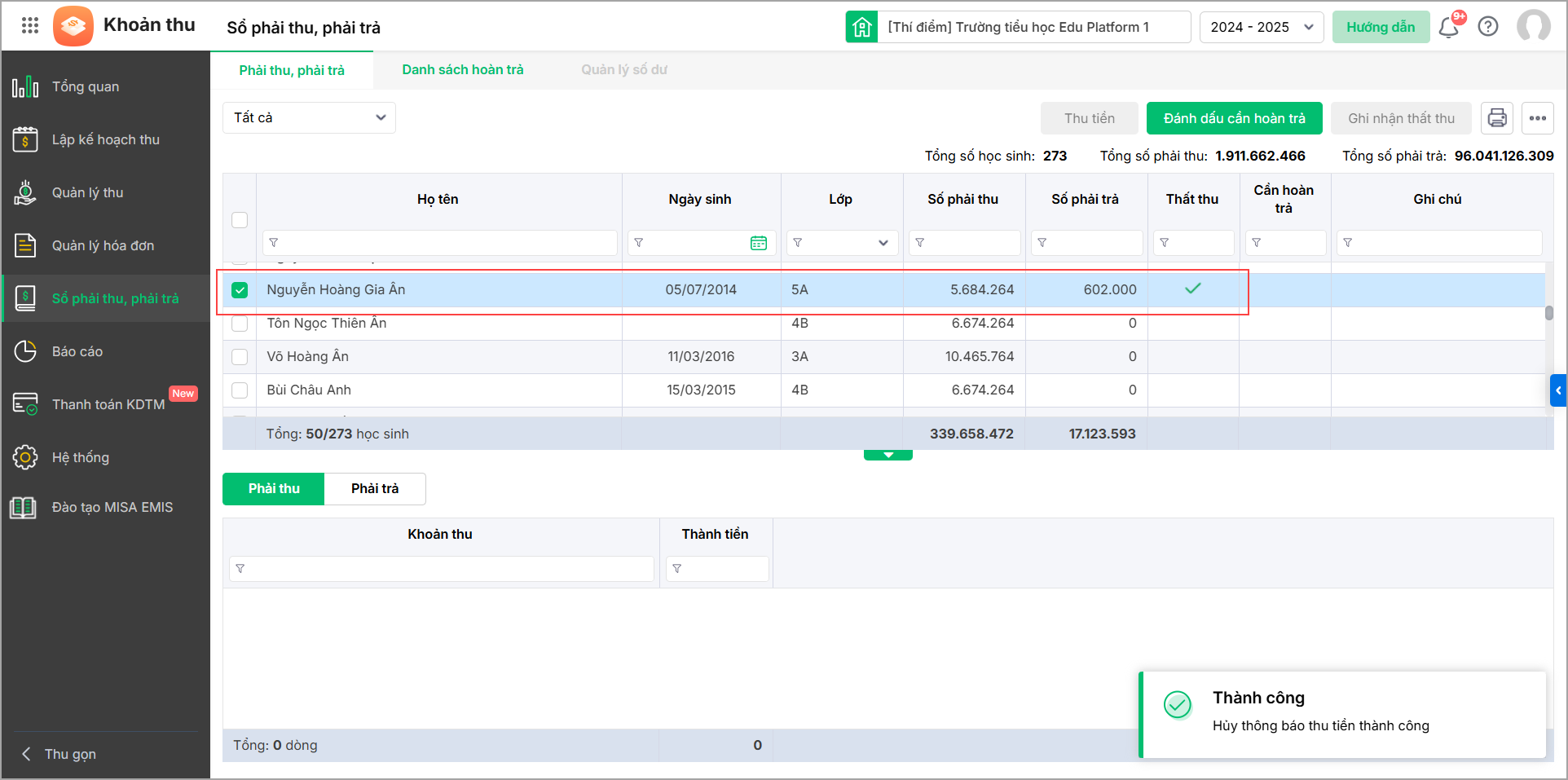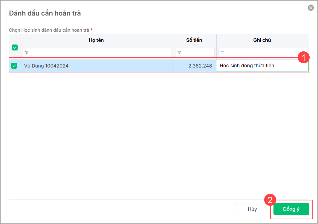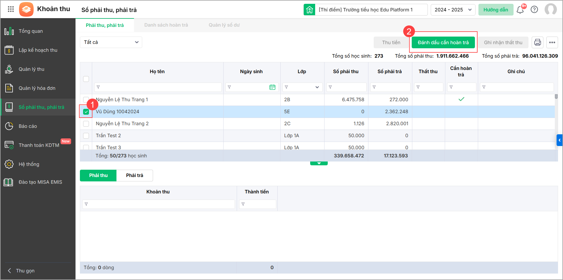1. Đối với học sinh có các khoản hoàn trả, số tiền tự động được cập nhật tại cột Số phải trả. Anh/chị chọn nhấn Đánh dấu cần hoàn trả để ghi nhận cần hoàn trả tiền thừa cho học sinh đó.