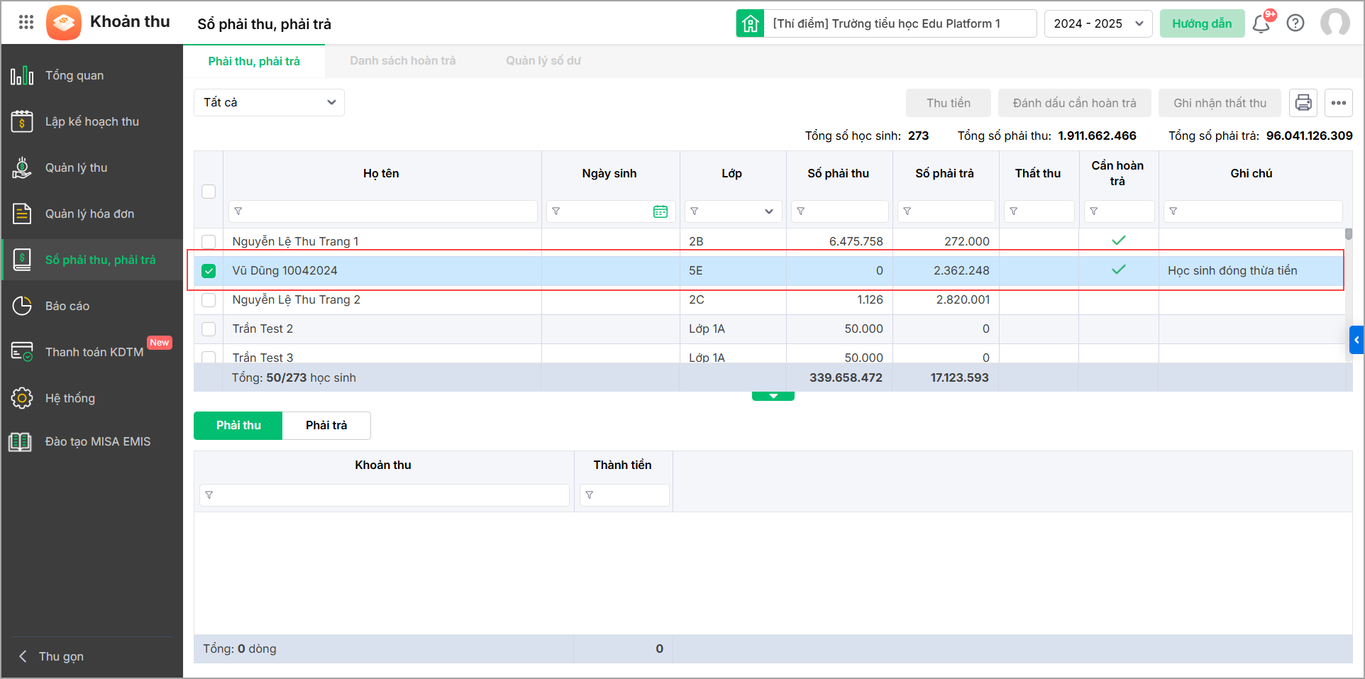 • Phần mềm tự động lấy lên danh sách học sinh với số tiền phải thu, phải trả (nếu học sinh nộp thừa), hoàn trả tương ứng sau khi Ghi nhận khoản chi trả.