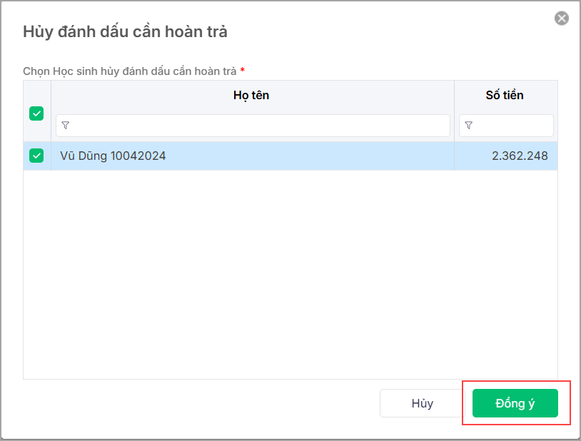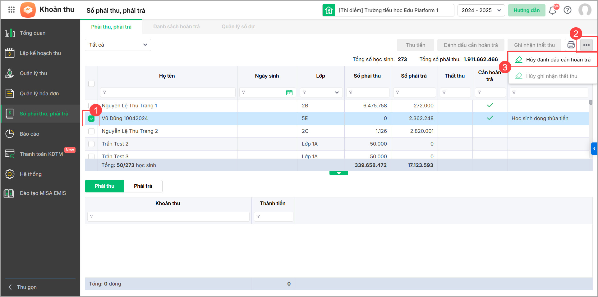 1. Tích chọn học sinh và nhấn vào biểu tượng dấu ba chấm, chọn Hủy đánh dấu cần hoàn trả.