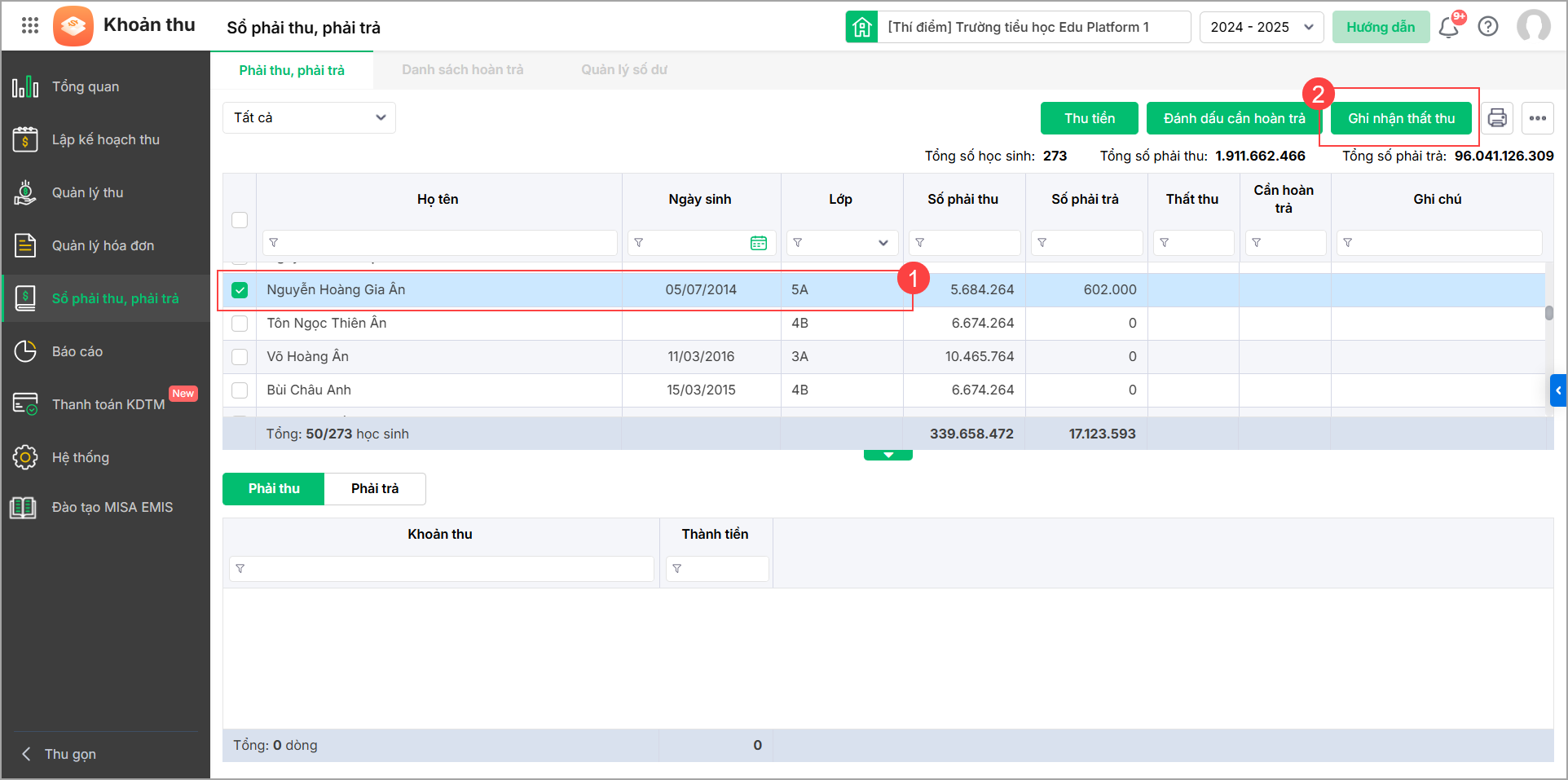 3. Sau khi hoàn tất, học sinh được đánh dấu tại cột Thất thu để anh/chị dễ dàng theo dõi.