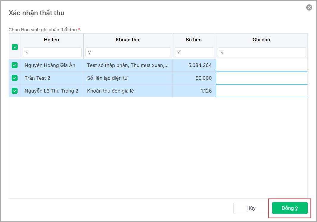 2. Xác nhận ghi nhận học sinh và số tiền thất thu, kèm ghi chú (nếu muốn). Nhấn Đồng ý.