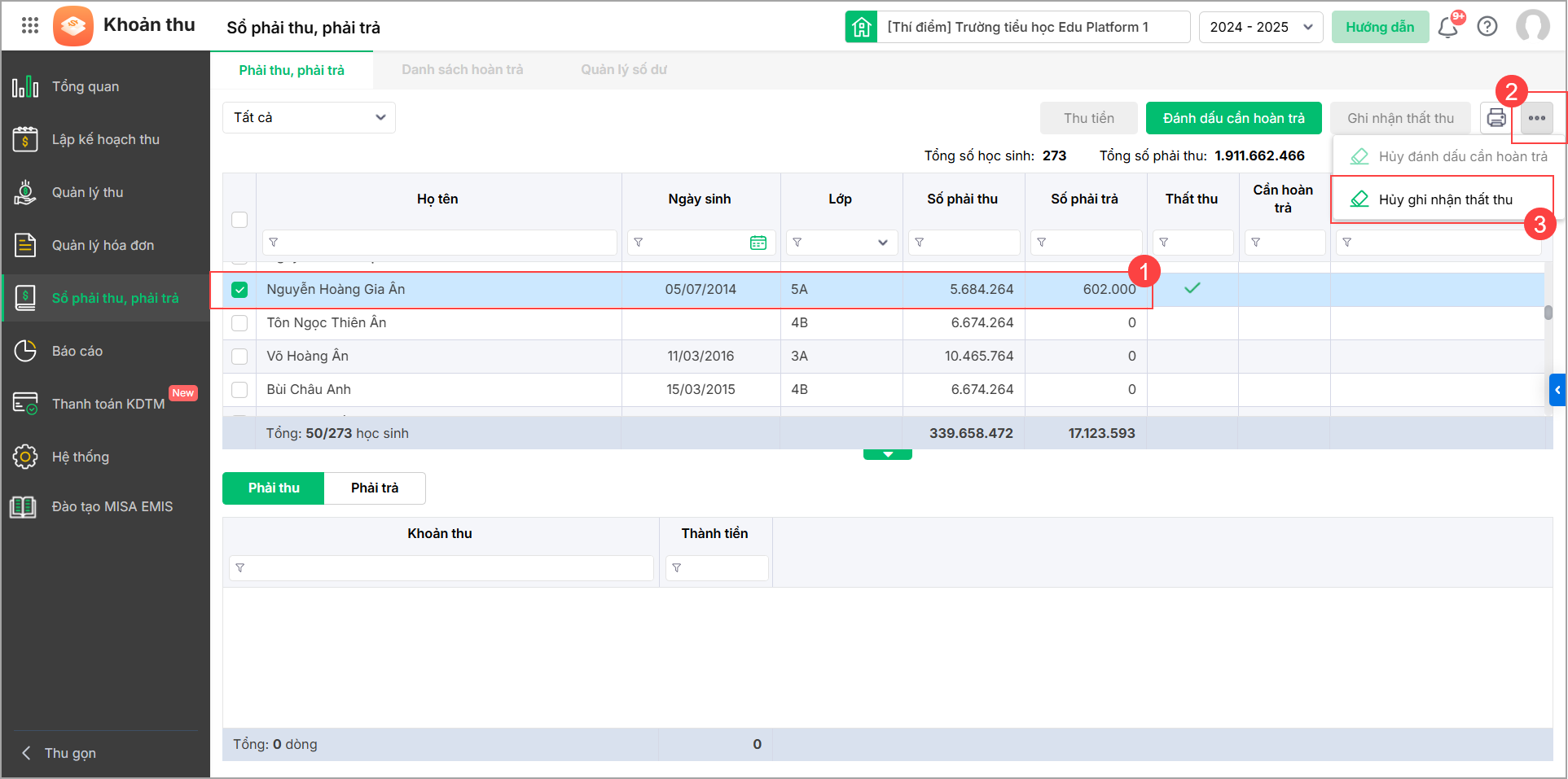 Lưu ý: Trường hợp cần hủy ghi nhận thất thu cho học sinh, anh/chị thao tác như sau: