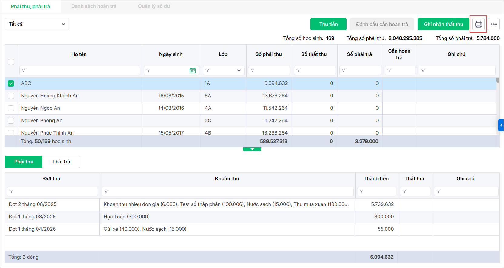 1. Nhấn biểu tượng máy in để in Danh sách học sinh thất thu.