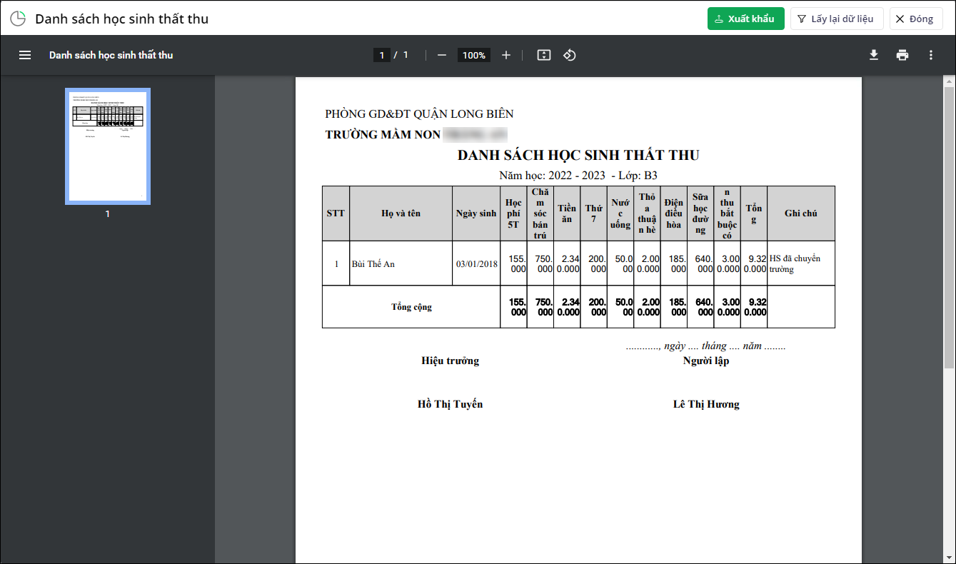 3. Nhấn Lấy dữ liệu. Phần mềm trả về danh sách học sinh thất thu theo tham số đã khai báo, anh/chi có thể tải về máy hoặc in danh sách để báo cáo cấp trên.