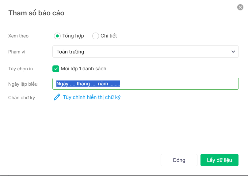 • Chân chữ ký: Cho phép thiết lập tùy chỉnh hiển thị chữ ký trên báo cáo.