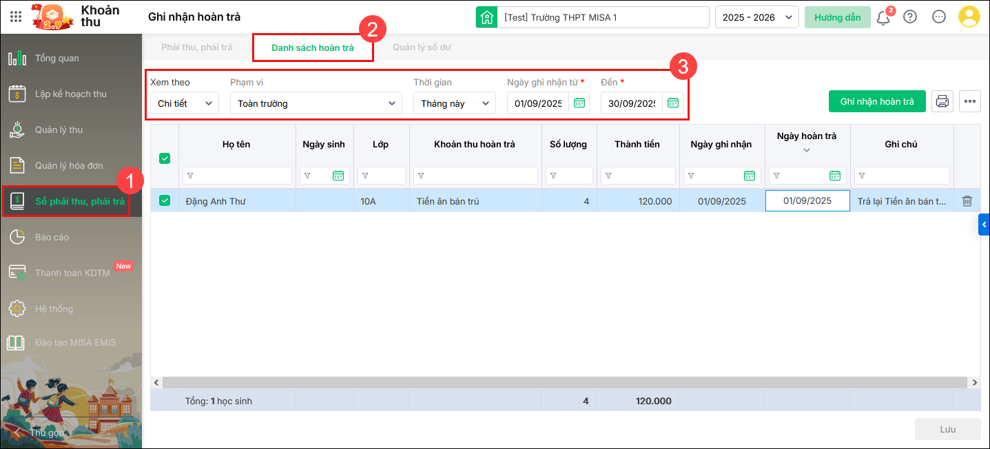 Bước 1: Vào Sổ phải thu, phải trả\Danh sách hoàn trả. Chọn Ghi nhận hoàn trả để tiến hành hoàn trả tiền thừa cho từng học sinh.