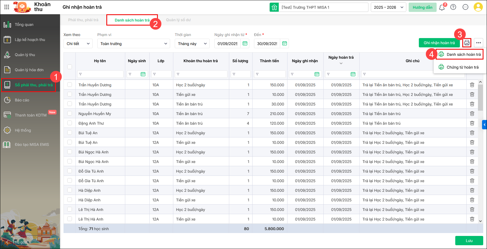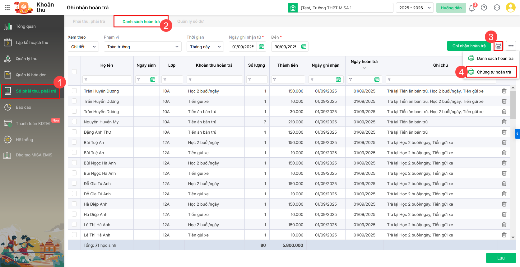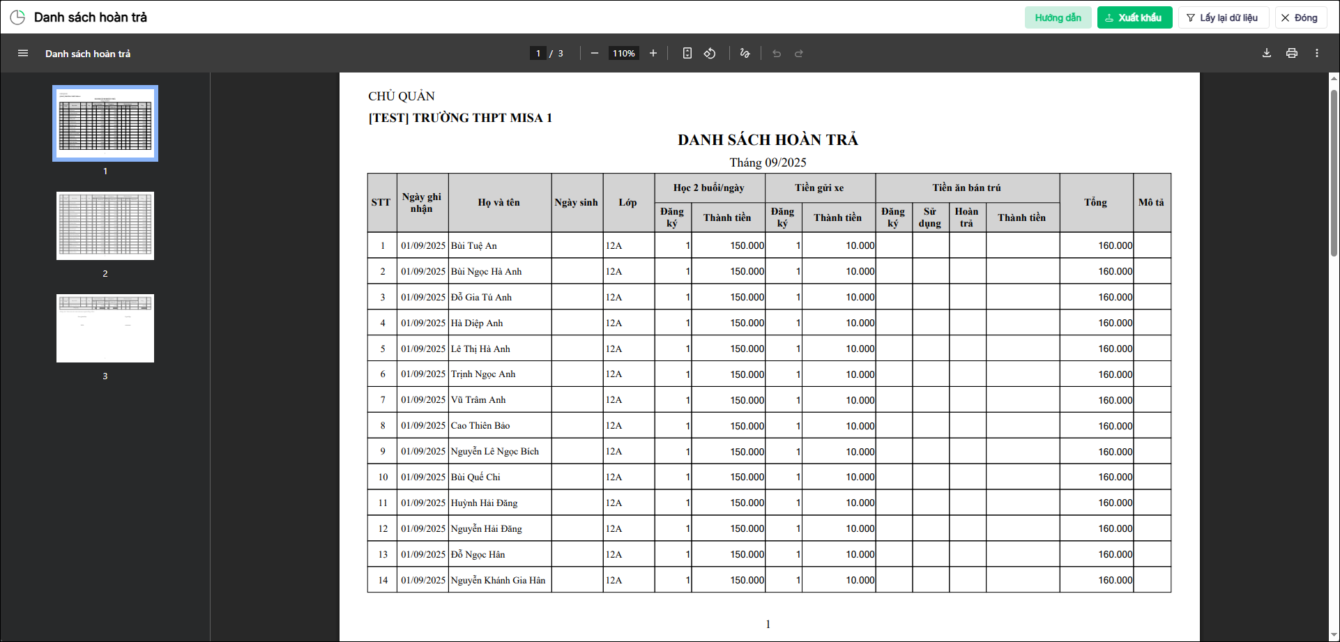 Trường hợp số lượng học sinh cần hoàn trả nhiều (cuối tháng, cuối năm học), bạn thực hiện như sau: