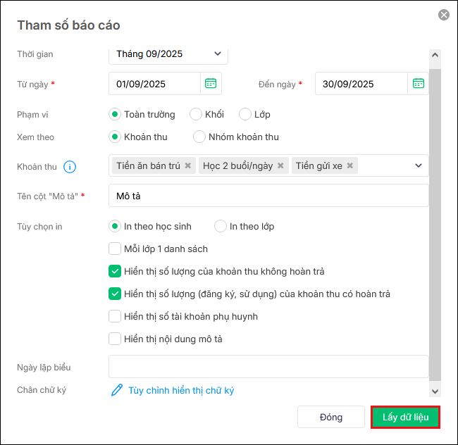 2. Phần mềm tự động lấy lên danh sách học sinh và khoản chi trả theo Phạm vi, thời gian tương ứng.