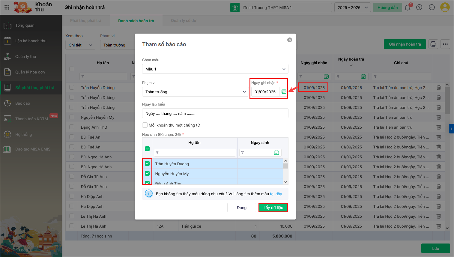 Bước 4: Tích chọn những học sinh cần ghi nhận hoàn trả. Nhấn Xác nhận.