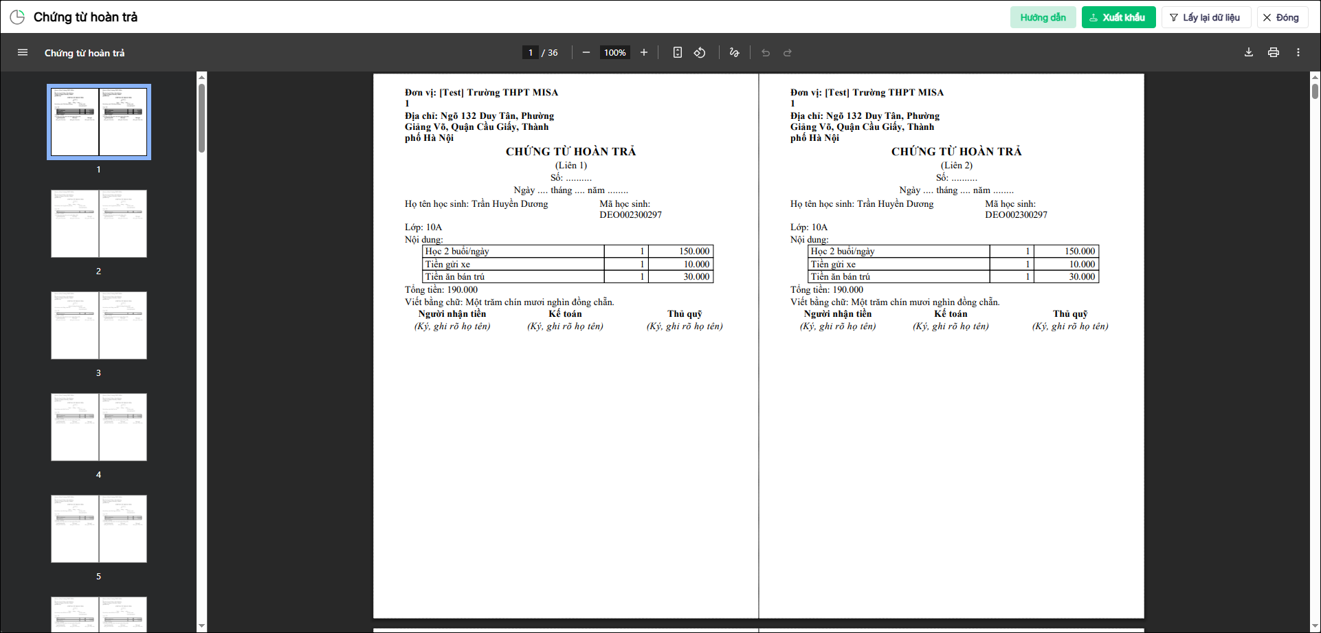 • Khoản thu cần hoàn trả: Chọn một hoặc nhiều khoản thu cần hoàn trả cho học sinh.
