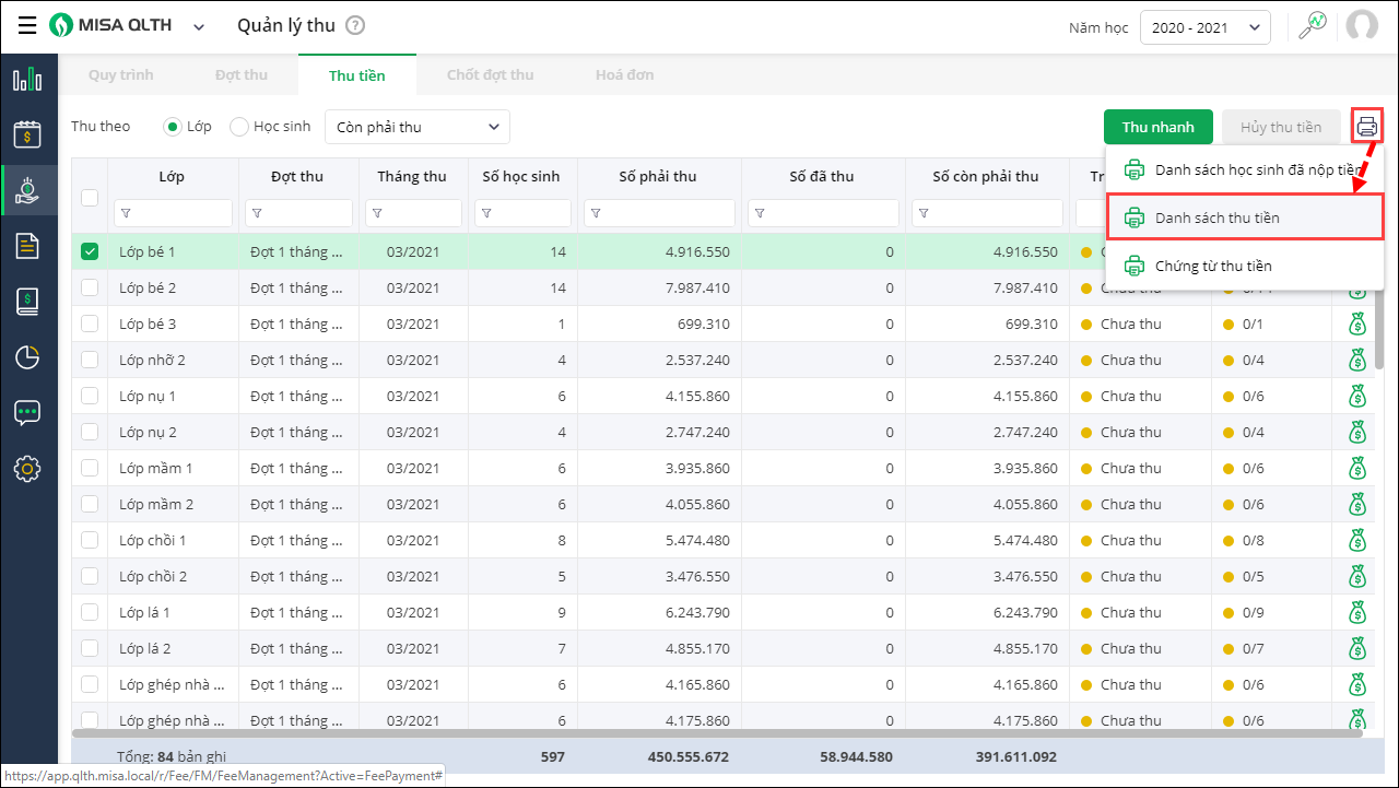 Anh/chị thực hiện in Danh sách thu tiền tại màn hình Đợt thu