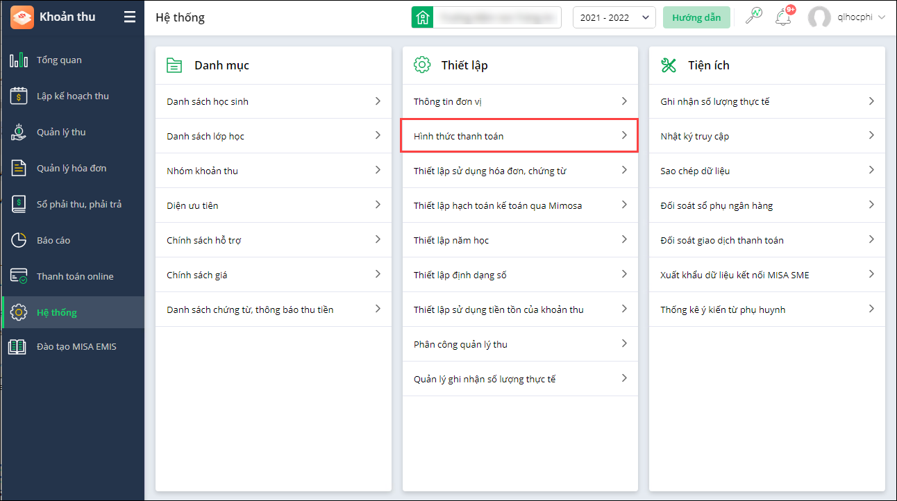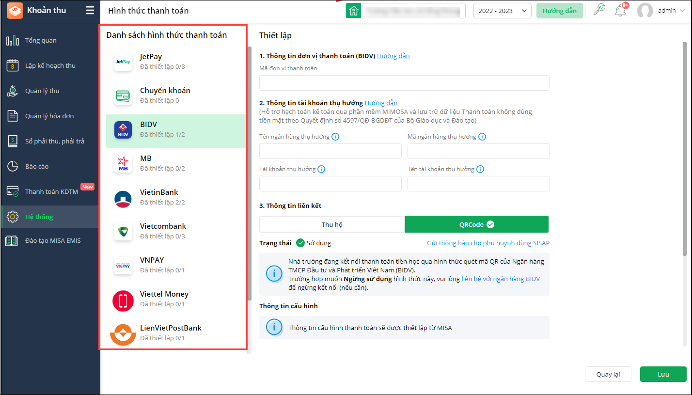 Giúp các trường khi có liên kết sử dụng với các đối tác/trung gian thanh toán trực tuyến như: JETPAY, BIDV, Vietcombank, MB bank, VNPAY, Viettel, Viettinbank, Agribank, Ngân lượng, Liên Việt Postbank,… có thể nhanh chóng, dễ dàng thiết lập thông tin phương thức thanh toán ngay trên phần mềm EMIS Khoản thu