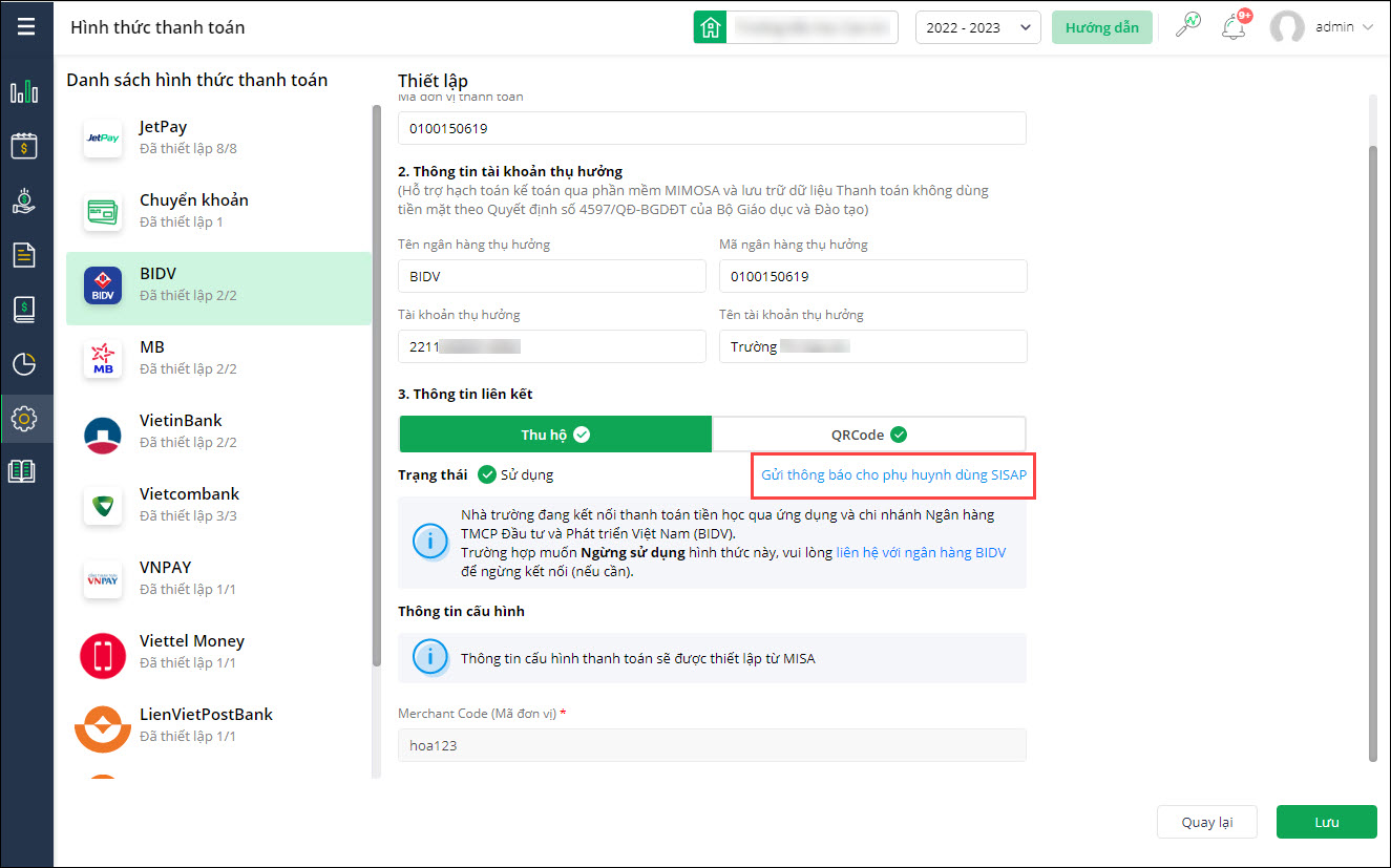 Bước 2: Sau khi nhà trường ký kết hợp đồng với các ngân hàng thì trường cung cấp các thông tin kết nối (Merchant) để thông kết nối với EMIS Khoản thu, MISA sẽ tự động khai báo cho anh/chị.
