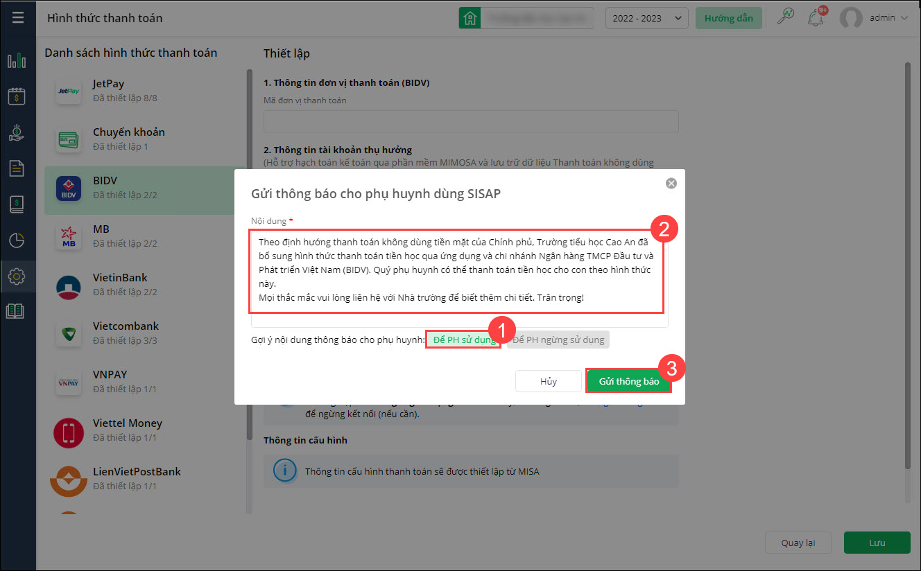 - Chọn Gửi thông báo cho phụ huynh dùng SISAP.