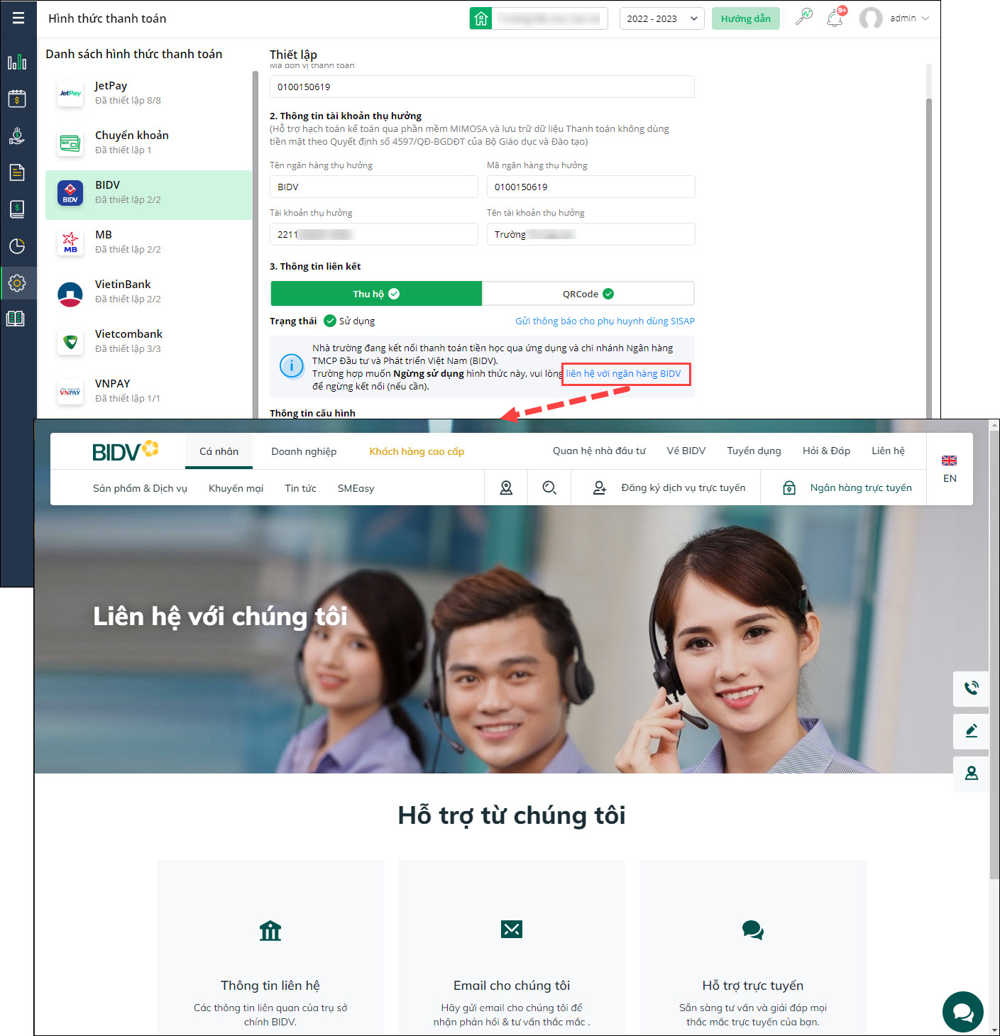 Hiện tại MISA đã thực hiện liên kết với các ngân hàng sau: BIDV, Vietcombank, MB bank, VNPAY, Viettel, Viettinbank,.. - Ngân hàng/ trung gian thanh toán sẽ gửi yêu cầu thiết lập thanh toán không dùng tiền mặt cho Nhà trường để MISA phê duyệt và thiết lập.