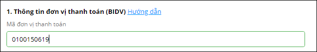 - Tại mục Thông tin đơn vị thanh toán, nhập Mã đơn vị thanh toán.