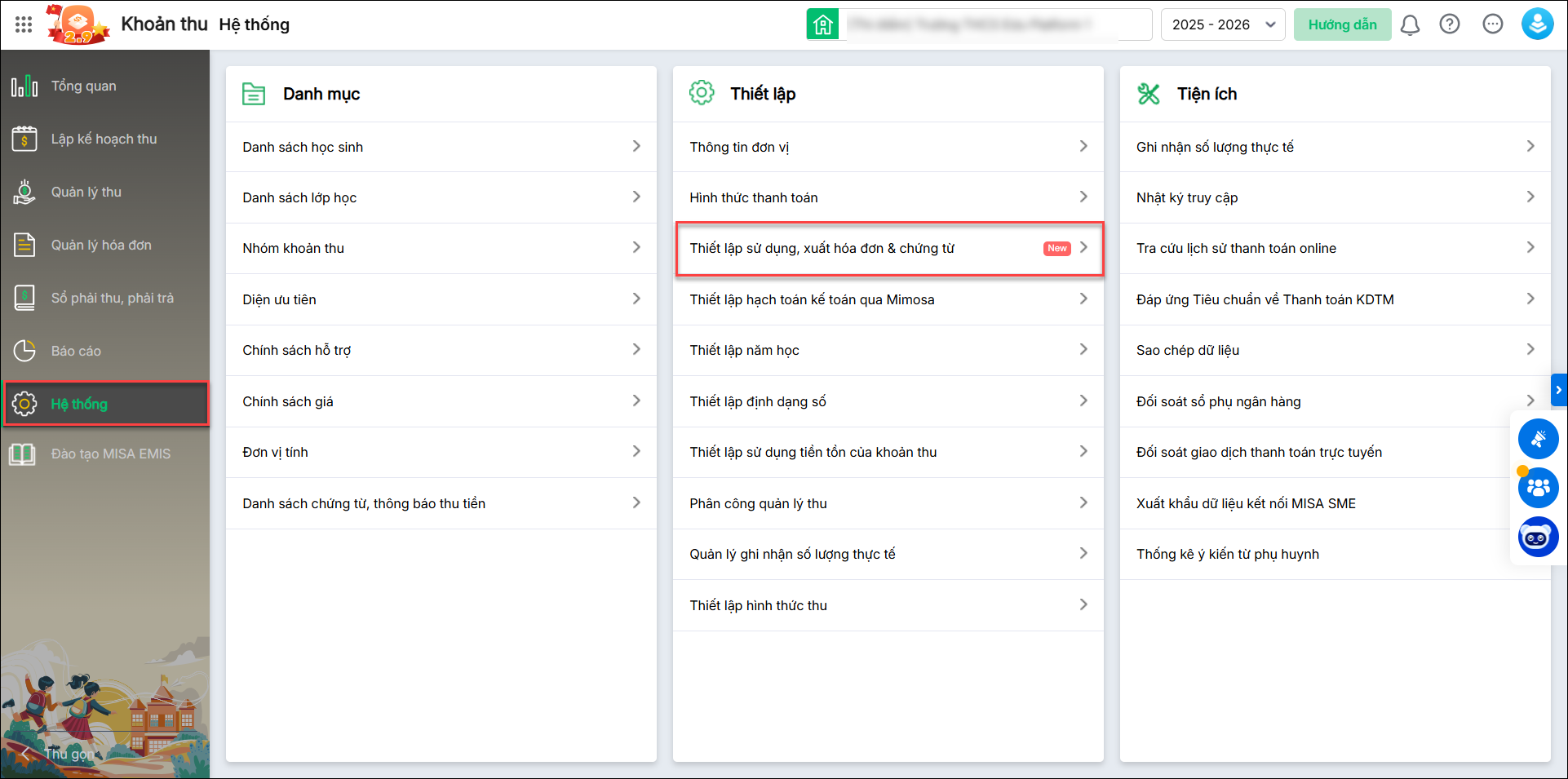 Sau khi hoàn tất, anh/chị thiết lập trên EMIS Khoản thu để xuất hóa đơn điện tử như sau: