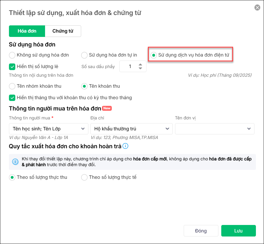 - Nhấn Lưu để lưu thông tin thiết lập sử dụng hóa đơn điện tử trên phần mềm.