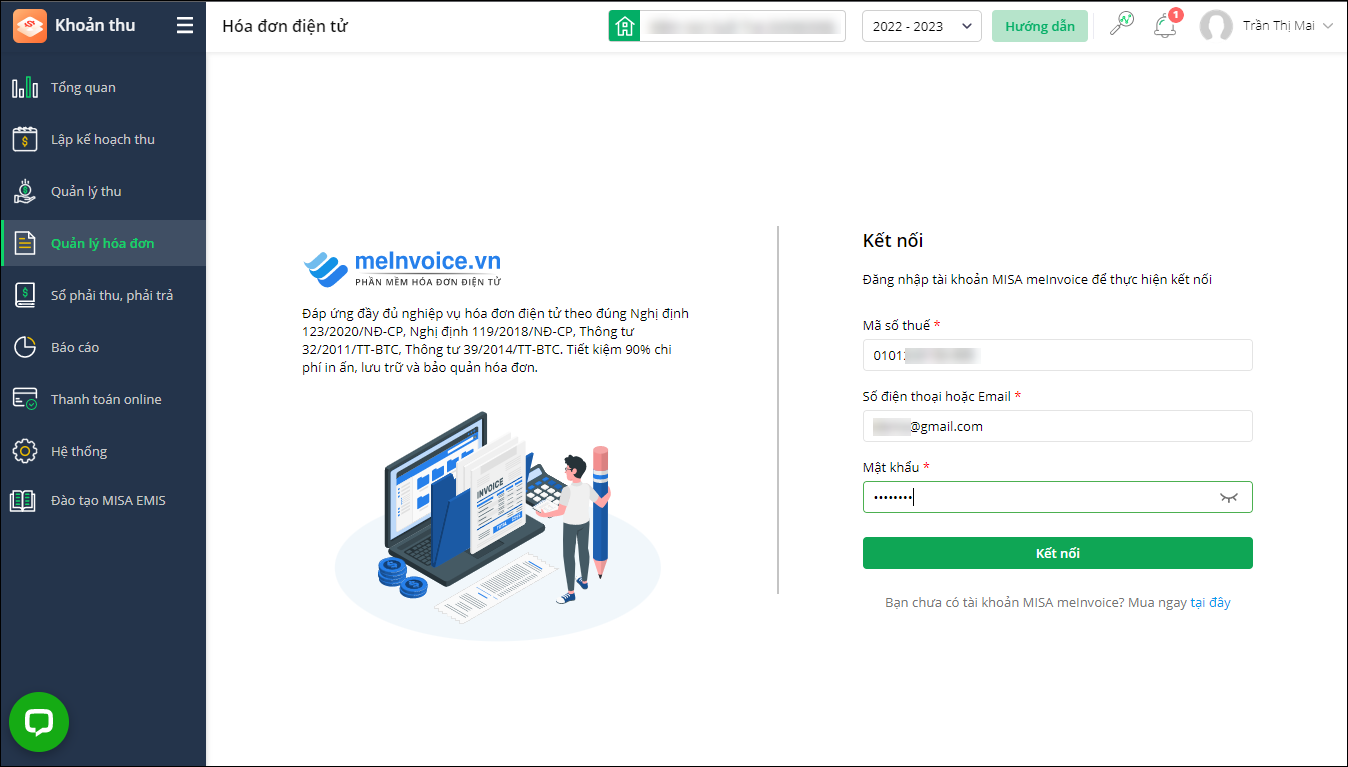 Bước 2: Kết nối phần mềm EMIS Khoản thu và MeInvoice