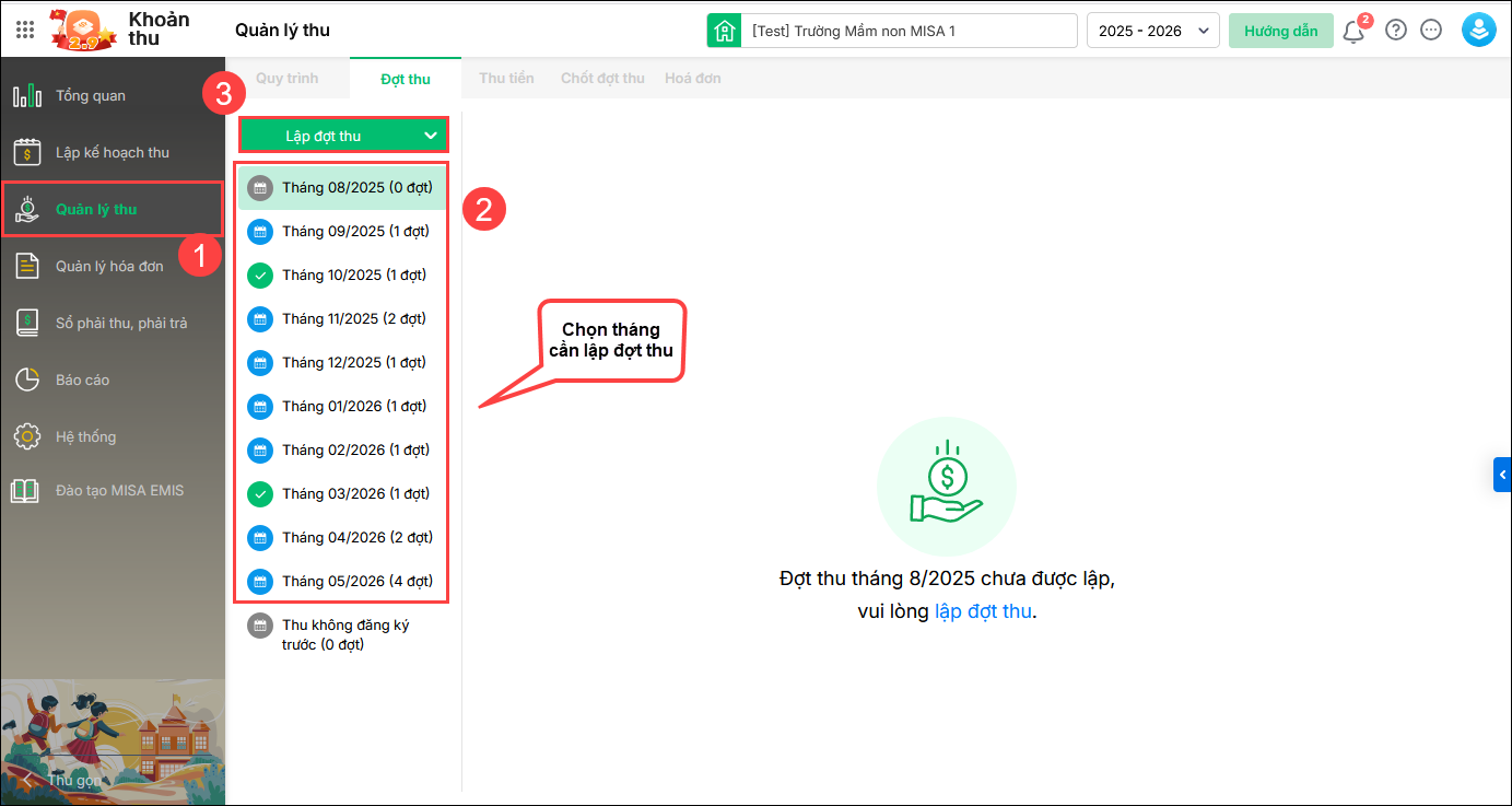 - Vào Quản lý thu\Đợt thu, chọn tháng cần lập, nhấn Lập đợt thu theo hướng dẫn tại đây.