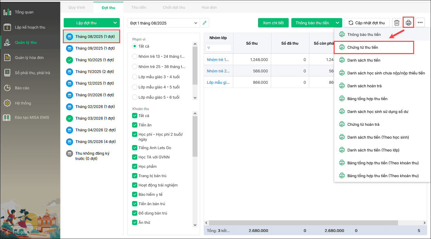 - Chọn đợt thu vừa lập và nhấn vào 🖨️ (biểu tượng máy in), chọn in Chứng từ thu tiền.