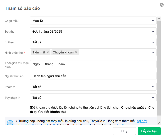 - Khai báo các tham số để in chứng từ, nhấn Lấy dữ liệu.