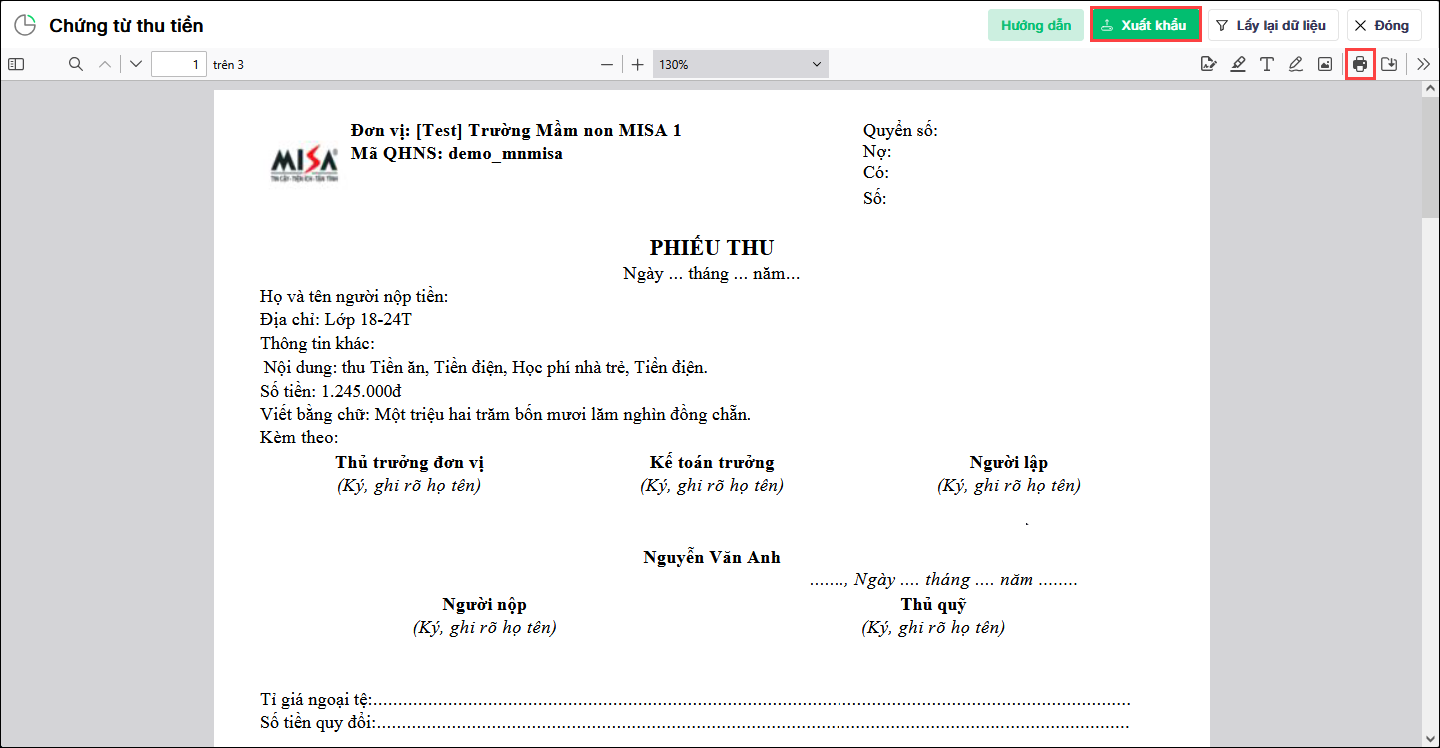 - Anh/chị nhấn vào 🖨️ (biểu tượng máy in) để in trực tiếp hoặc nhấn Xuất khẩu để tải về máy chứng từ thu tiền.