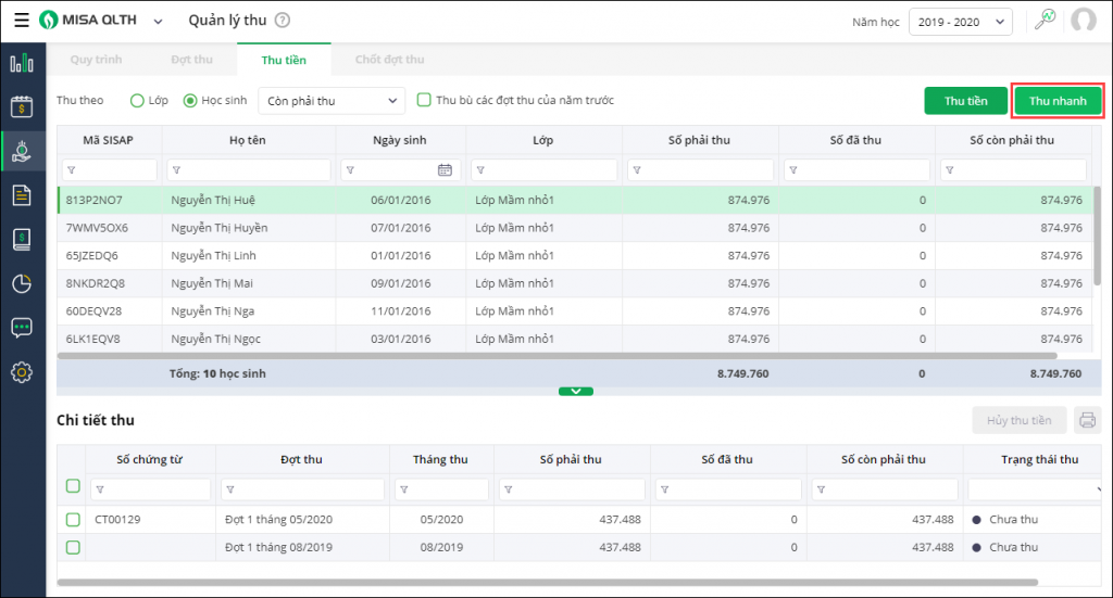 - Nhấn vào biểu tượng “thu tiền” để thực hiện thu từng đợt tương ứng