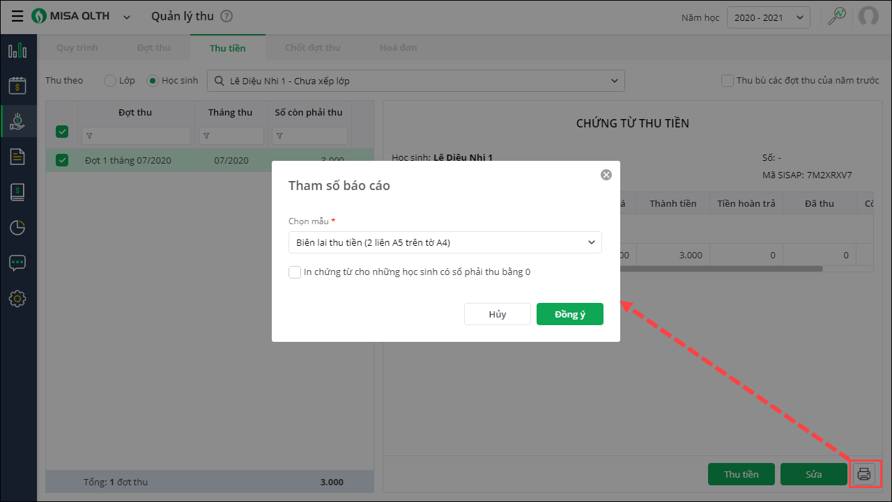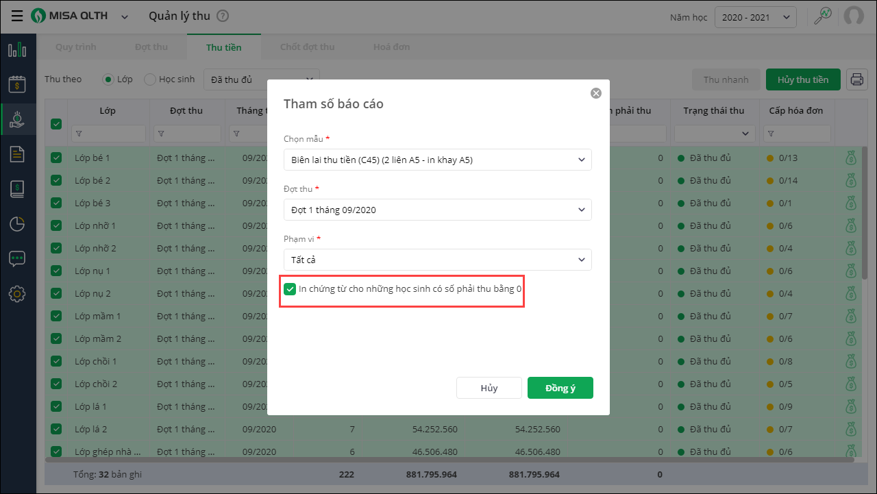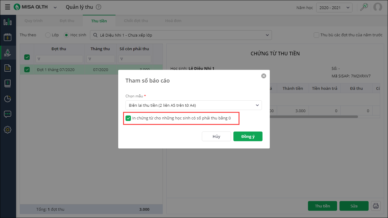 - Trường hợp có học sinh trong đợt thu cần in không phải nộp tiền nhưng in chứng từ để xác nhận với phụ huynh, tích chọn In chứng từ cho những học sinh có số phải thu bằng 0