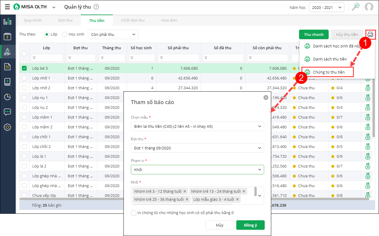 - Lựa chọn Mẫu in, Đợt thu cần in, Phạm vi (Tất cả, Khối, Lớp)
