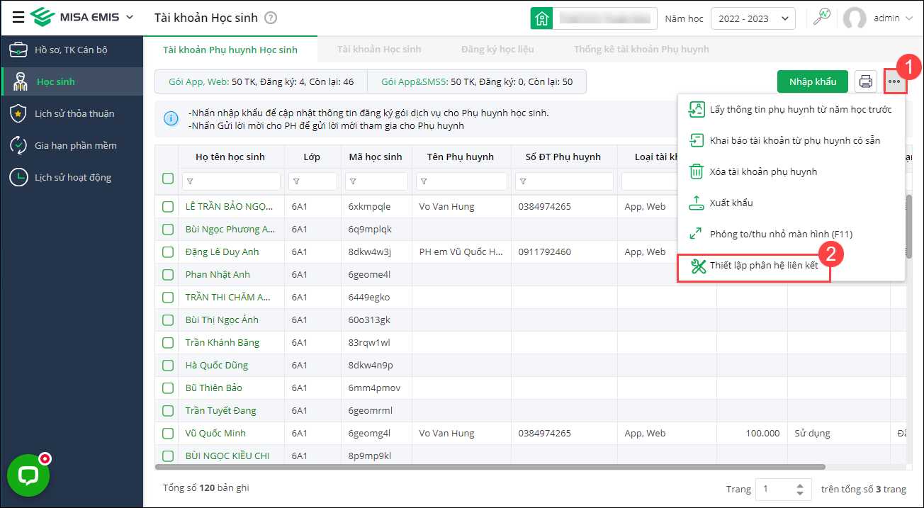 - Nhấn vào biểu tượng dấu ba chấm, chọn Thiết lập phân hệ liên kết.