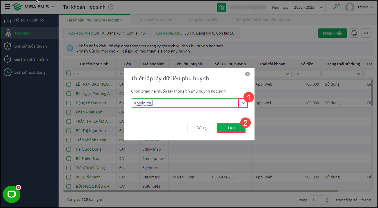 - Lựa chọn phân hệ cần lấy dữ liệu tài khoản cho phụ huynh: Khoản thu hoặc Học sinh. Nhấn Lưu.