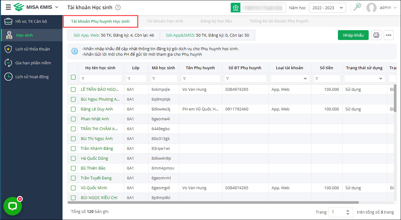 Lưu ý: Tại đây, nhà trường thực hiện đăng ký sử dụng gói tài khoản App &SMS nếu nhà trường chưa thực hiện đăng ký.