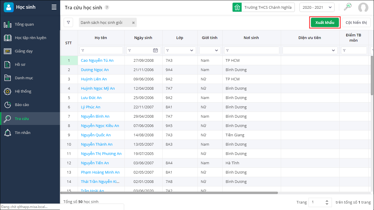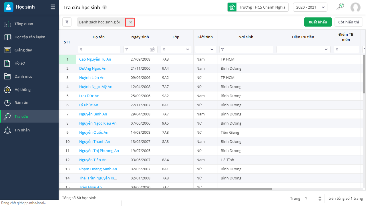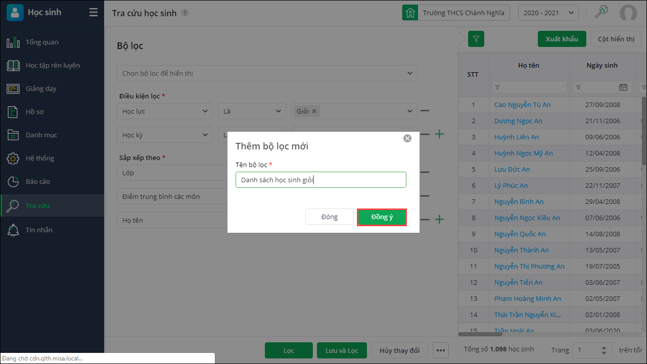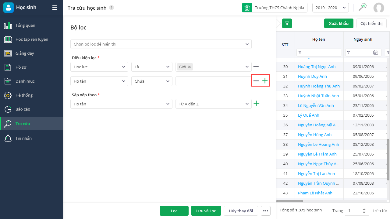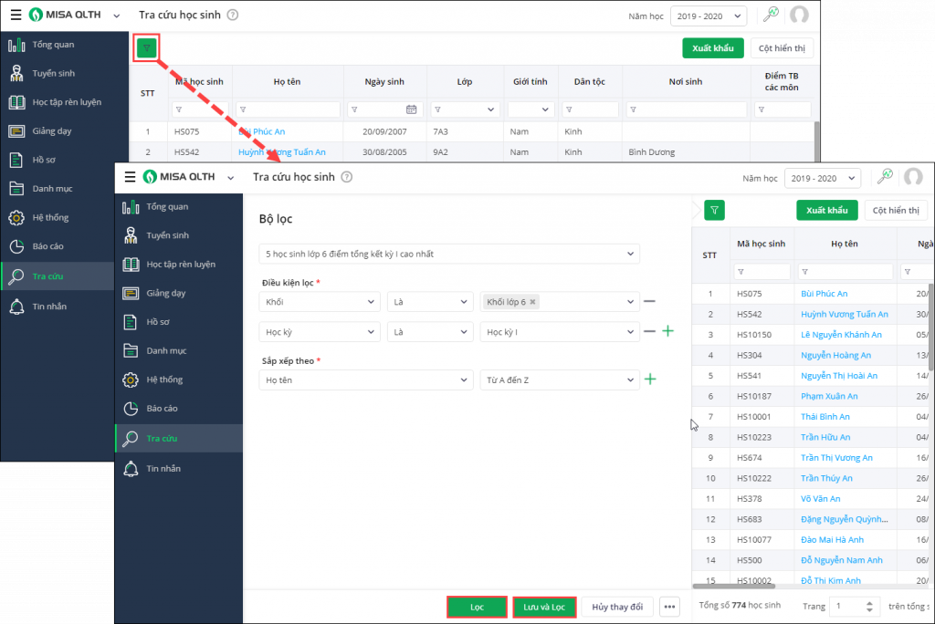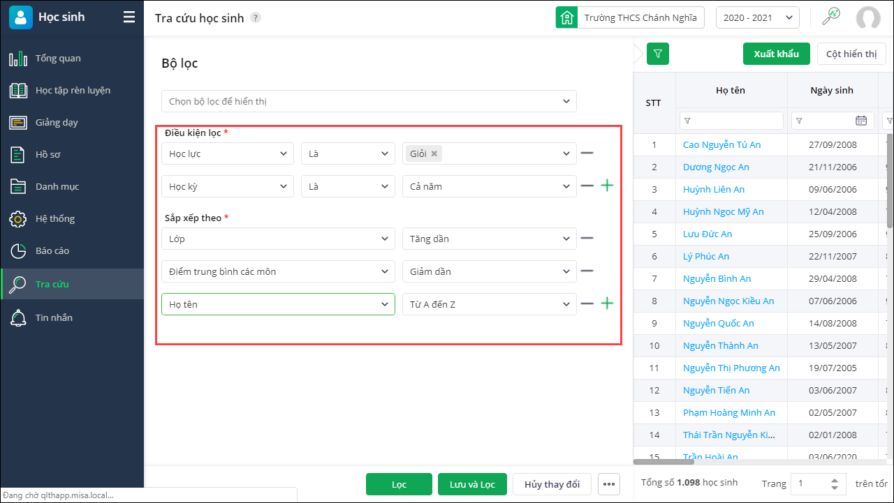 - Sau khi hoàn tất nhấn Lọc để lọc thông tin học sinh. Hoặc nhấn Lưu và Lọc để lọc thông tin học sinh đồng thời lưu thông tin bộ lọc lại