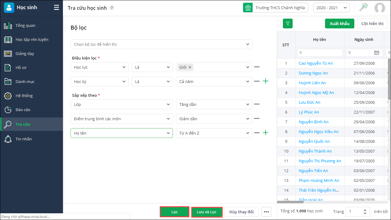 - Sau khi hoàn tất nhấn Lọc để lọc thông tin học sinh. Hoặc nhấn Lưu và Lọc để lọc thông tin học sinh đồng thời lưu thông tin bộ lọc lại