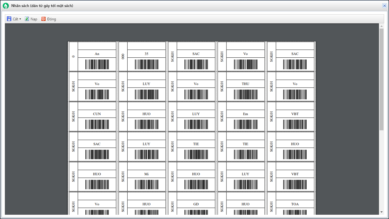 Cán bộ thư viện có thể in nhãn sách có phần thông tin số đăng ký cá biệt từ phần gáy đến phần mặt sách để dễ dàng tìm sách như sau: