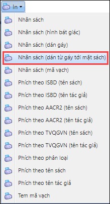 - Lựa chọn sách cần in nhãn sách. Nhấn In\Nhãn sách (dán từ gáy tới mặt sách)