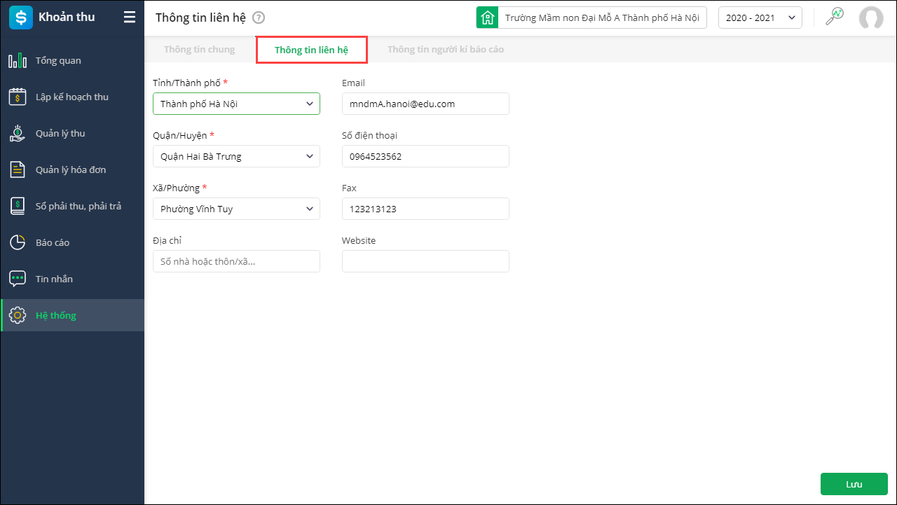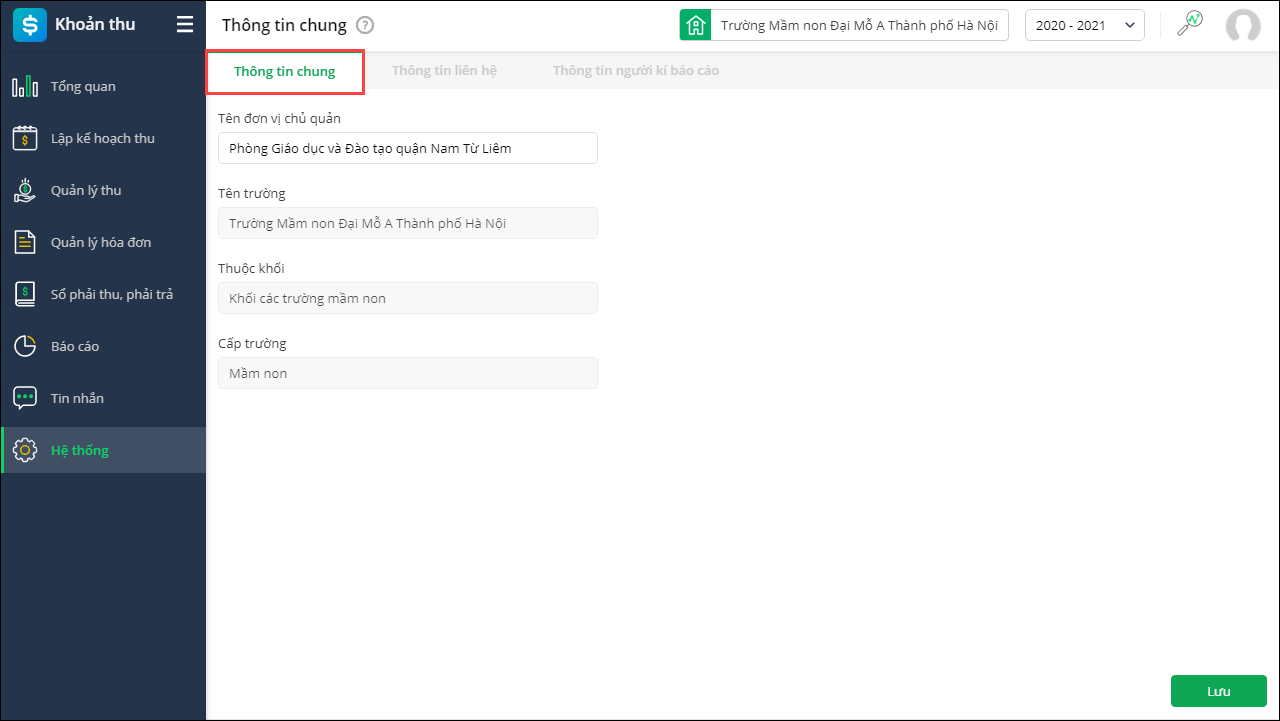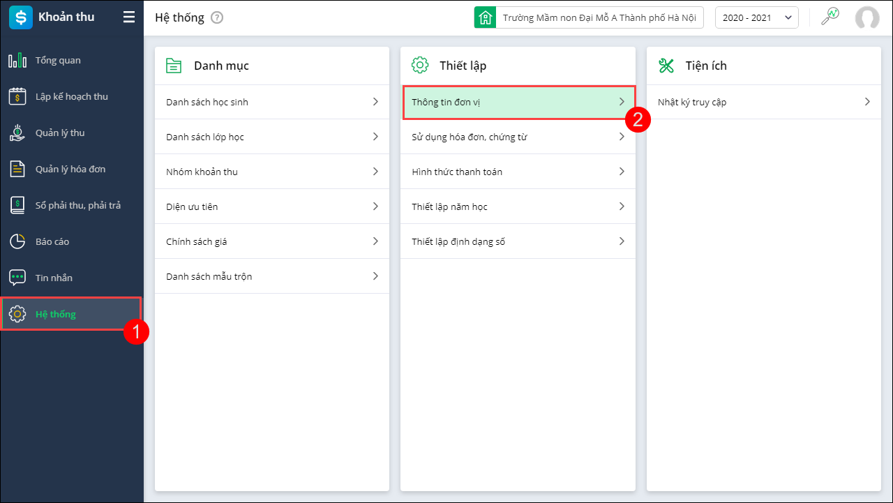 Vào Khoản thu\Hệ thống\Thiết lập\Thông tin đơn vị