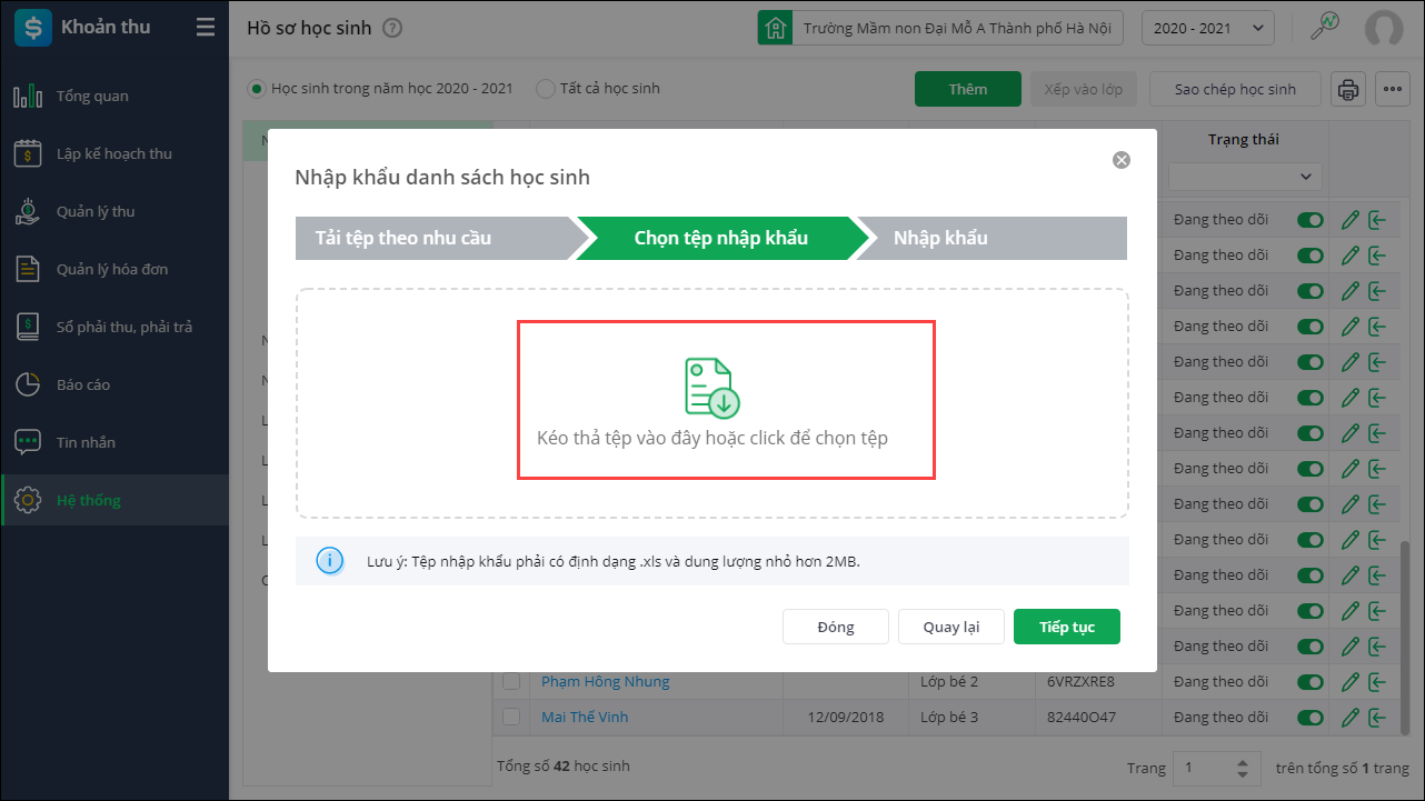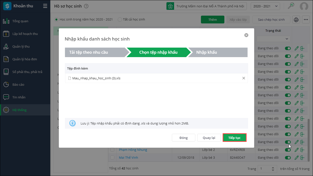 Lưu ý: Anh/chị nên nhập khẩu những học sinh chưa tồn tại trên phần mềm, với những học sinh đã tồn tại, anh chị thực hiện Sao chép danh sách học sinh từ năm học trước.
