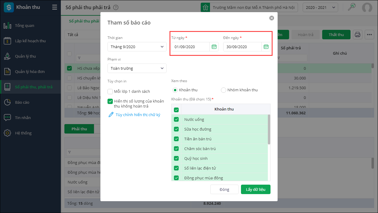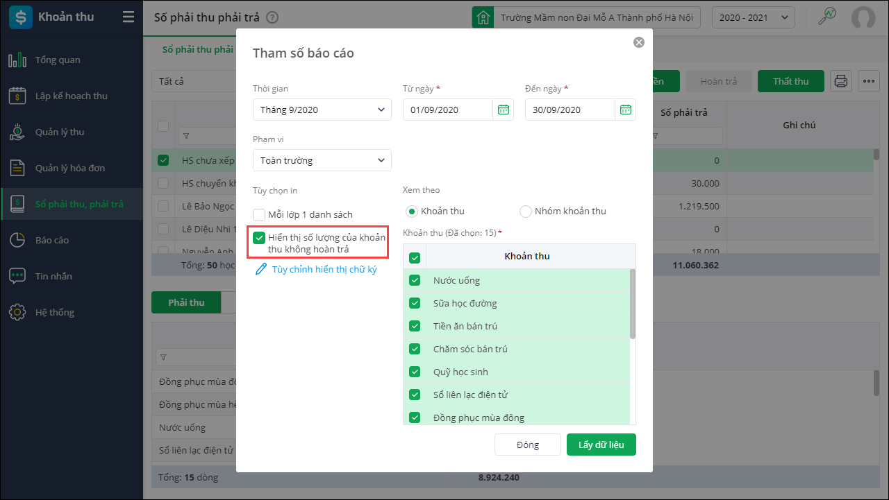 Lưu ý: Trường hợp không muốn hiển thị khoản thu không cần hoàn trả thì bỏ tích chọn Hiển thị số lượng khoản thu không hoàn trả
