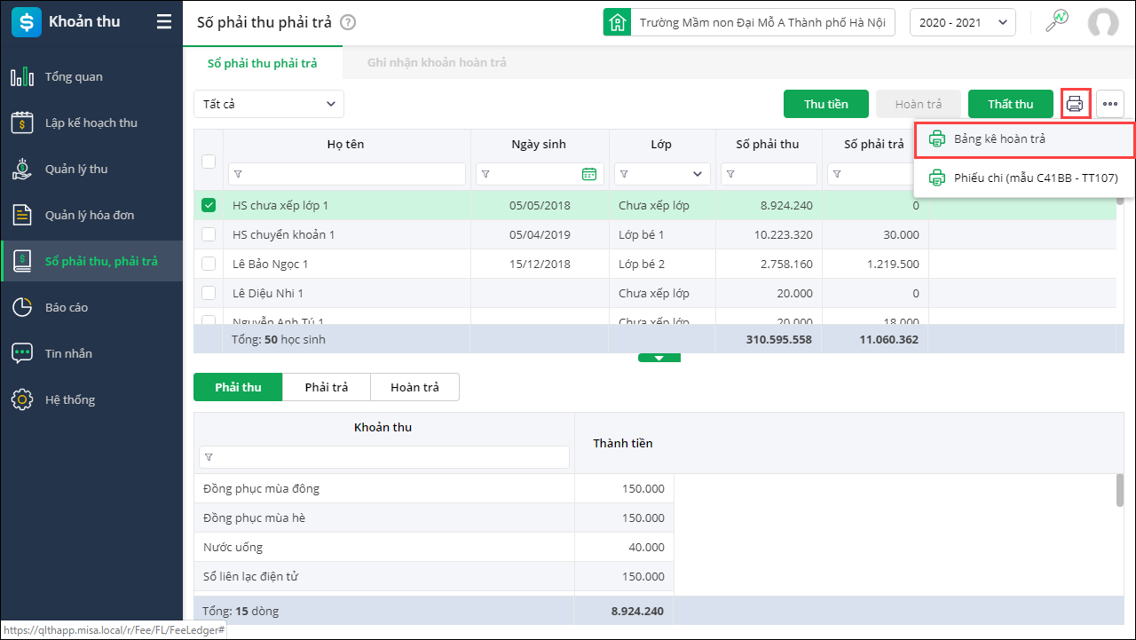Kế toán mong muốn có danh sách hoàn trả để thực hiện hoàn trả tiền cho phụ huynh