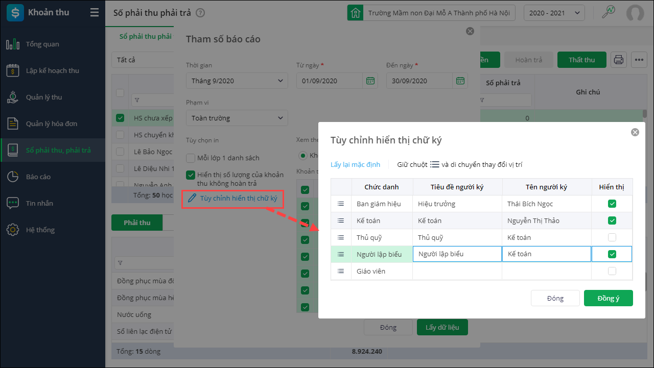 • Từ phiên bản R100: Phần mềm cho phép in danh sách hoàn trả trên Sổ phải thu, phải trả để thực hiện trả tiền cho phụ huynh